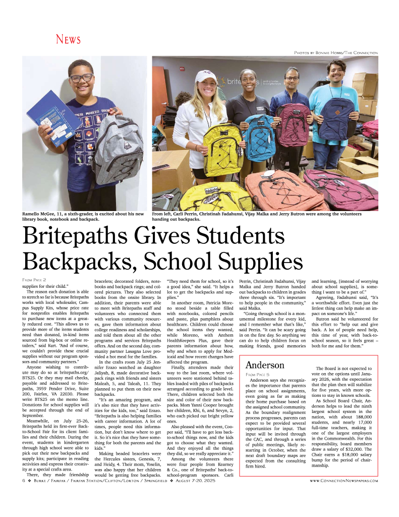 Britepaths’ Back to School Fair was featured on the cover of The Fairfax Connection, showcasing a joyful moment from the event: a Britepaths client watching as her daughter creates decorative backpack rings alongside her sisters. The publication’s August 2025 edition featured a story about Britepaths’ 2025 Back to School Program, highlighting our efforts to equip 500 local students and 60 teachers with backpacks and essential school supplies.