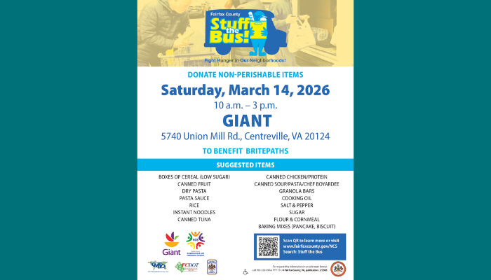 In 2025, 36% of the Greater Washington area experienced food insecurity. On Saturday, March 14, from 10am-3pm, join Britepaths in partnership with Fairfax County for the March 2026 Stuff the Bus food drive to combat hunger in our community. A Fastran bus will be parked at the Giant in Clifton, Va (5740 Union Mill Rd.)…