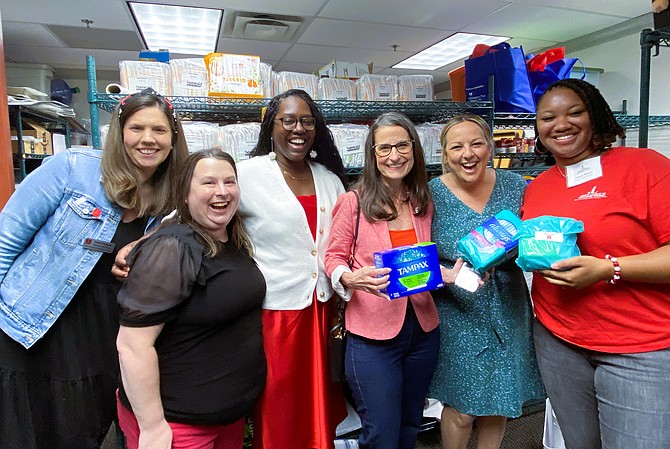 JLNV members and menstrual-equity advocates Jennifer Boysko and Holly Seibold are excited about Britepaths’ period pantry. From left are Sarah Staropoli, Miranda Lewis, Sukari Gaylor, Boysko, Seibold, and Imani Myers. Photo by Bonnie Hobbs.
